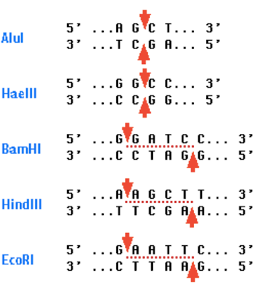 Enzim restriksi endonuklease berperan dalam memotong molekul DNA pada urutan basa yang sangat spesifik. Gambar di atas menunjukkan beberapa jenis enzim restriksi endonuklease dengan urutan basa spesifik sebagai situs pemotongan enzim tersebut. Pada gambar di atas, dapat pula dilihat dua jenis hasil pemotongan enzim restriksi, yakni enzim yang menghasilkan porongan dengan ujung tumpul (AluI dan HaeIII) dan ujung lengket (BamHI, EcoRI, dan HindIII).